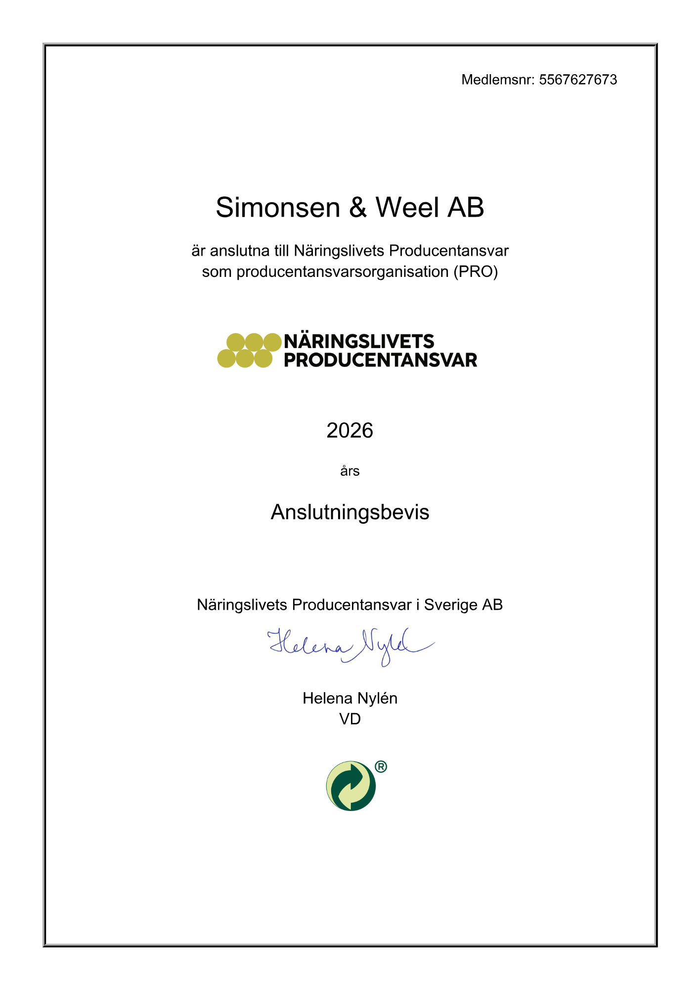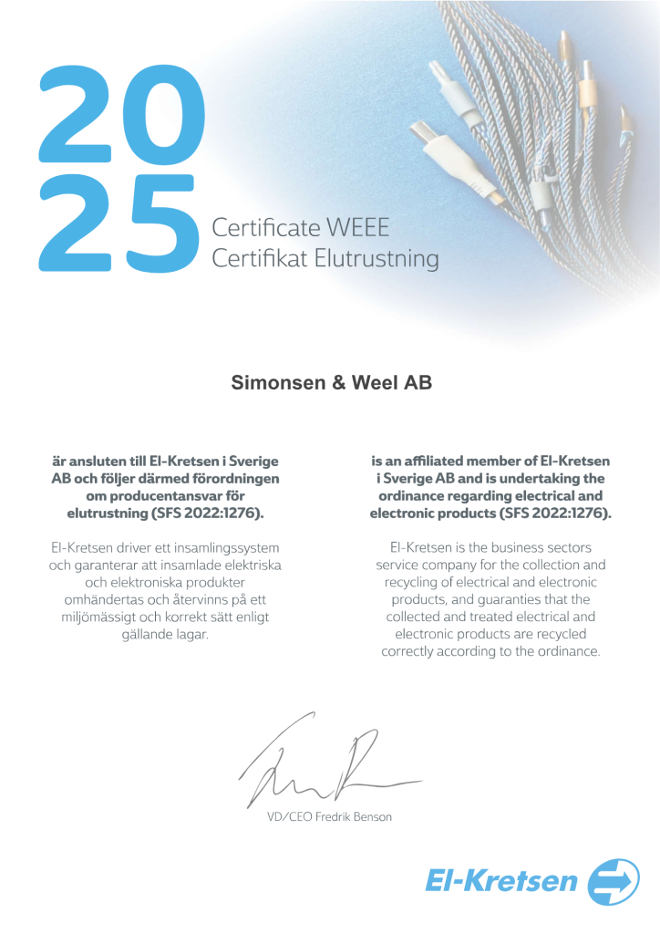 Simonsen & Weel har skrivit avtal med El-Kretsen, miljövänlig batterihantering, och med fti Förpacknings & Tidningsinsamlingen, ett materialbolag som tar hand om förpackningarna till våra levererade produkter.