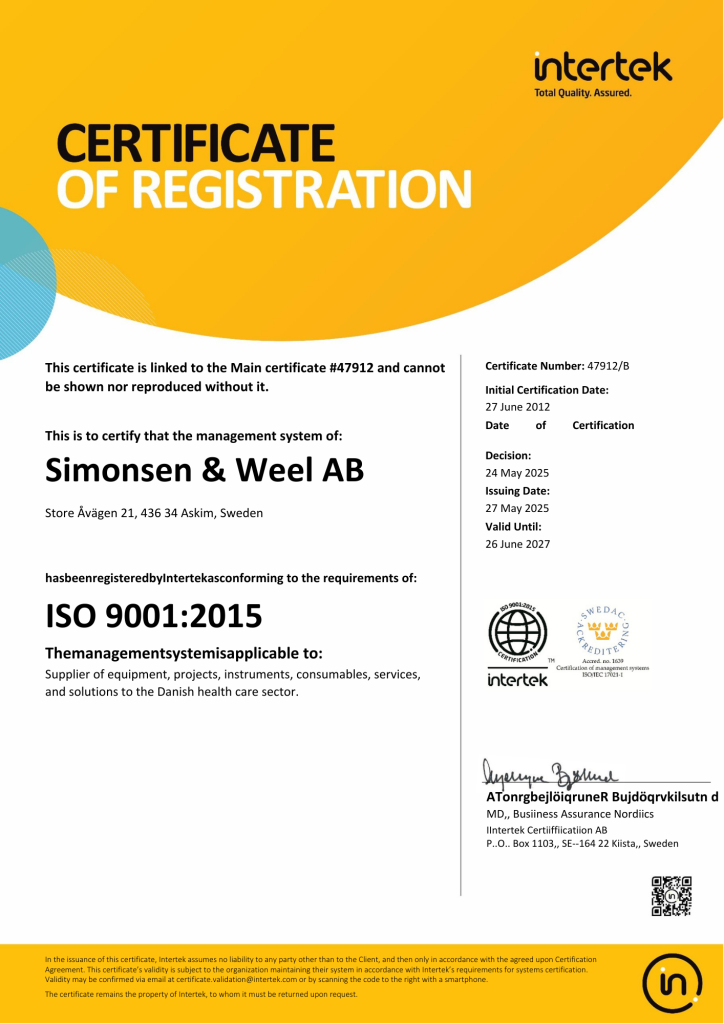Simonsen & Weels är certifierat enligt ISO 9001:2015 och ISO 13485:2016 för medicintekniska produkter. Vårt miljöledningssystem är certifierat enligt ISO 14001:2015.